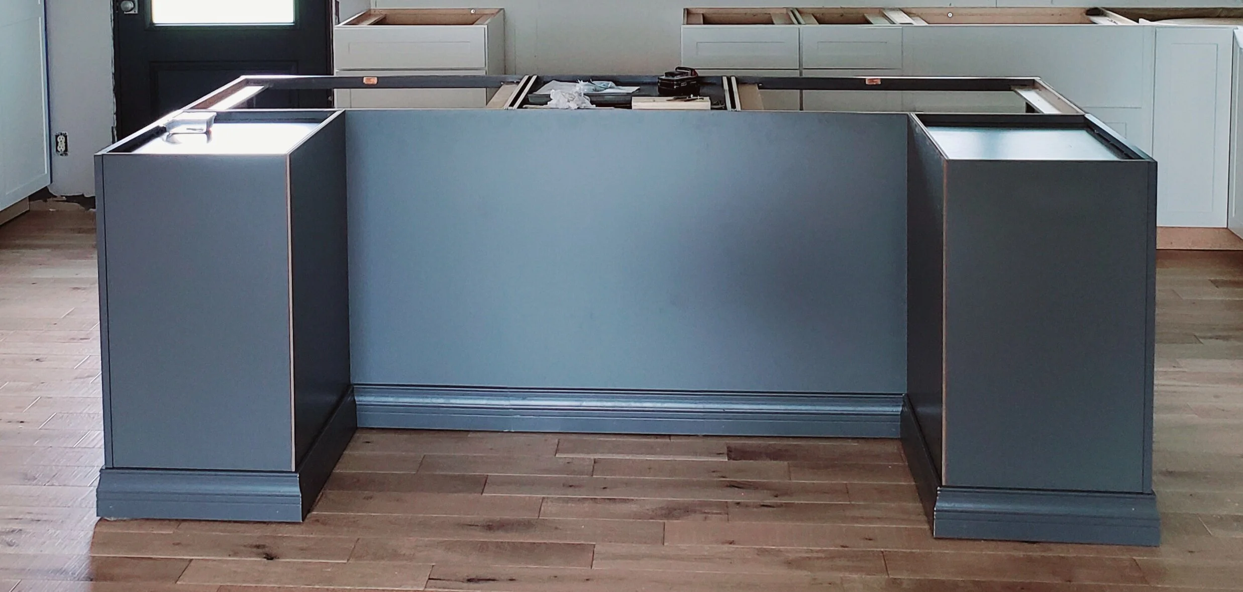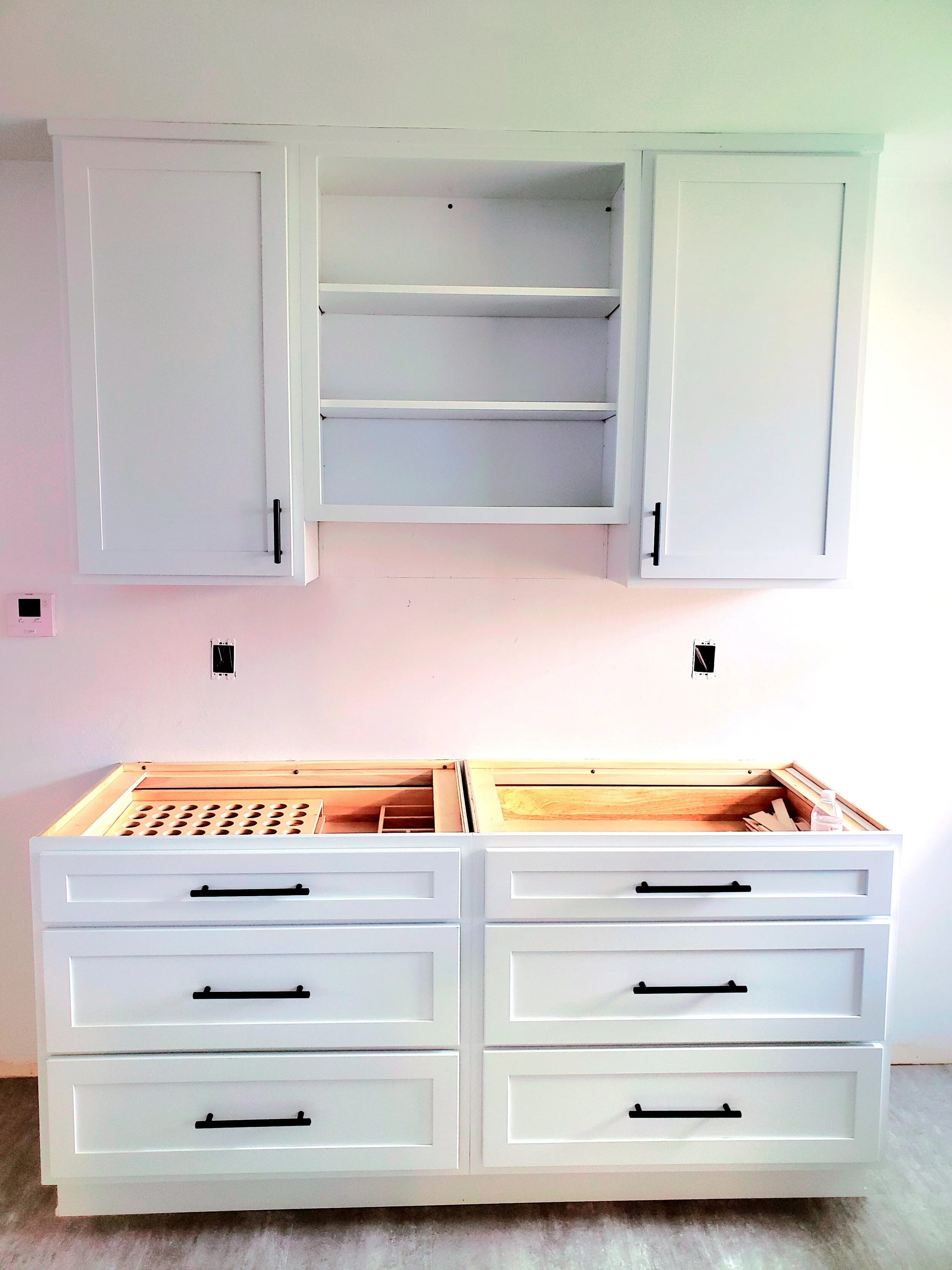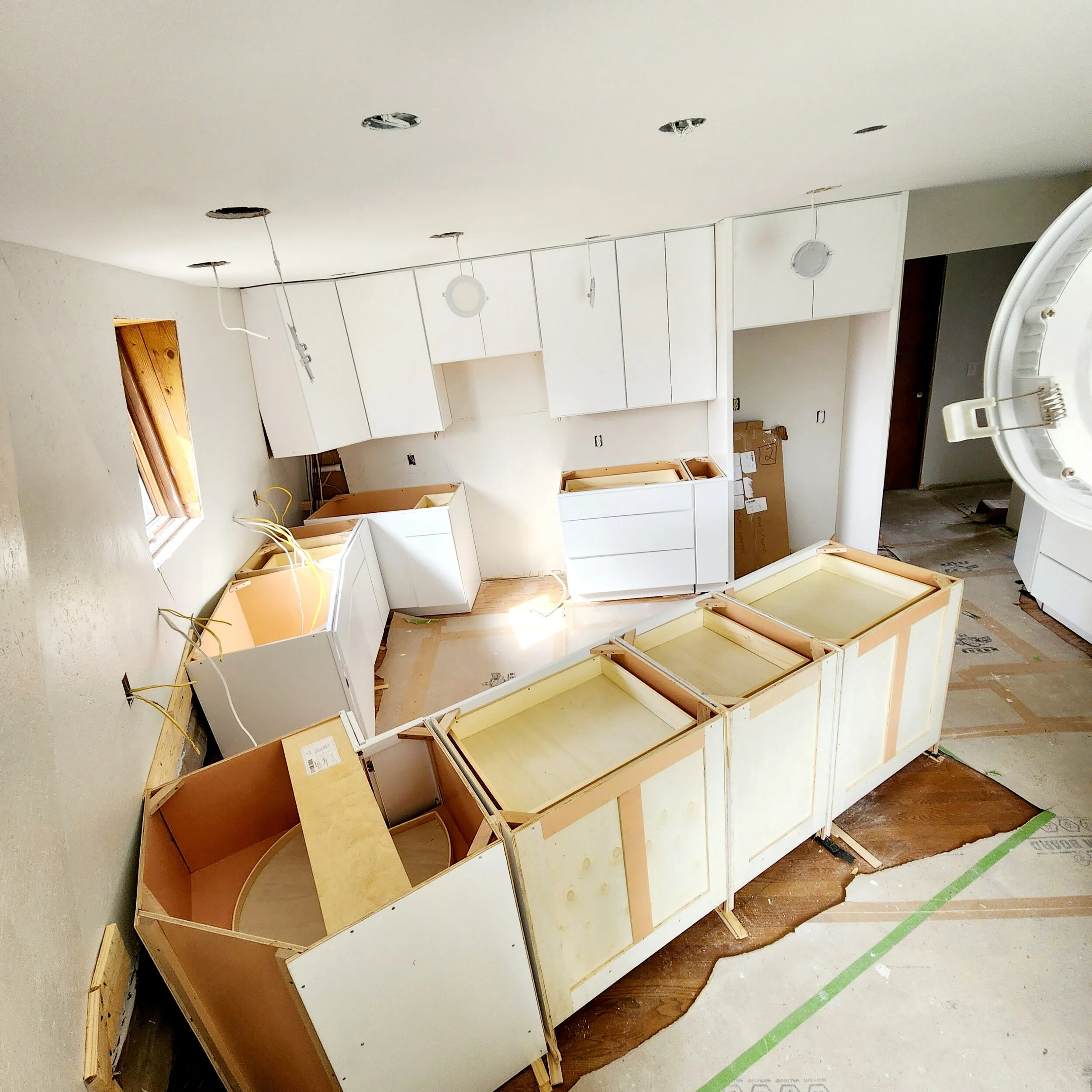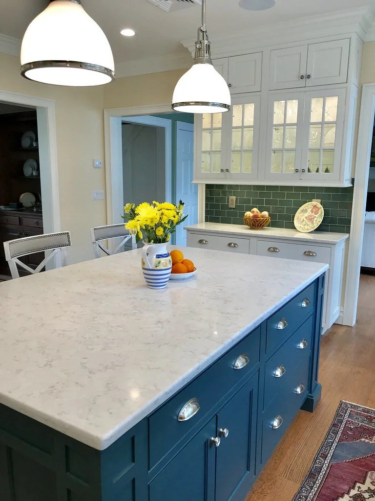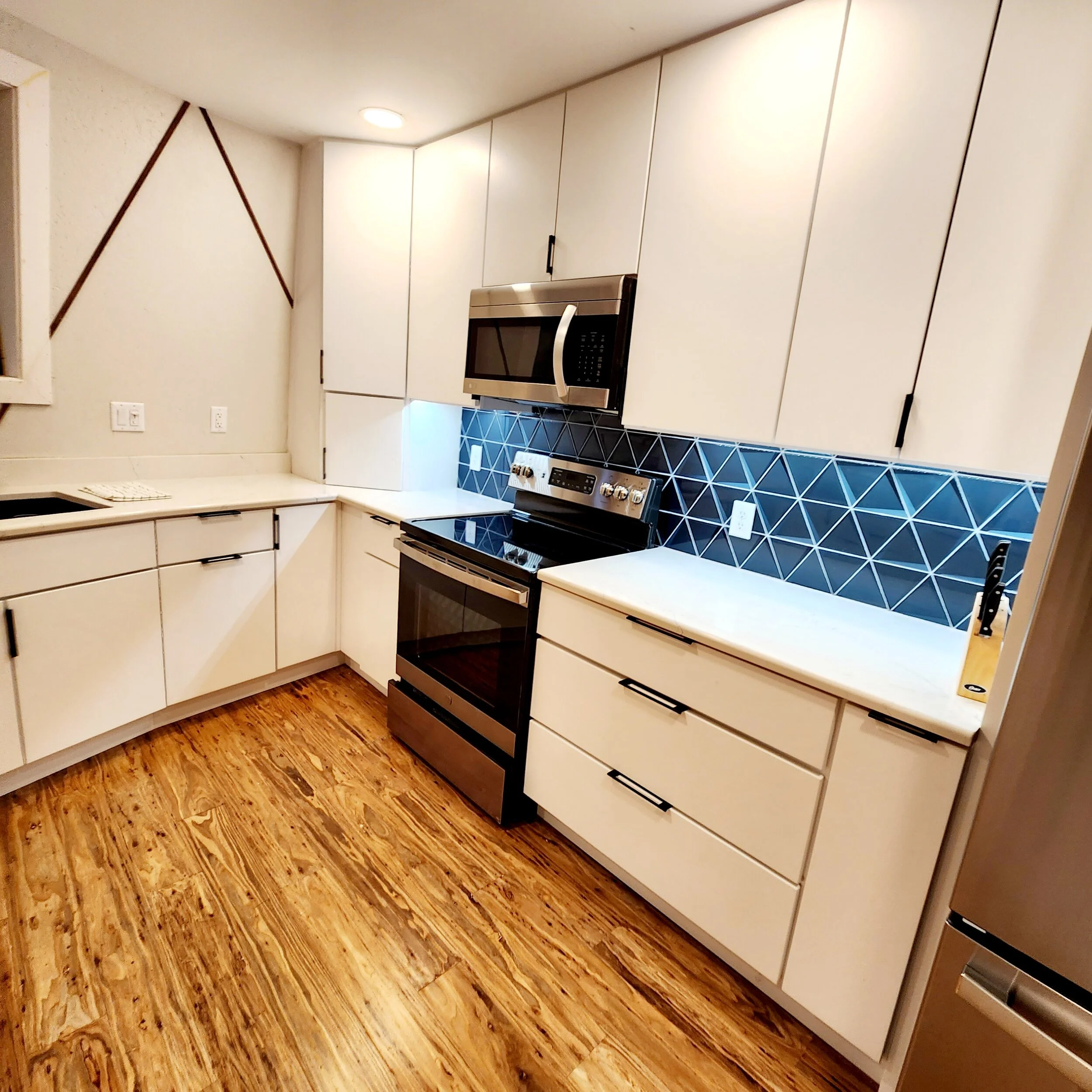 A fully custom kitchen remodel completed by Composite Carpentry, all white modern countertops with a unique blue glass triangle backsplash.